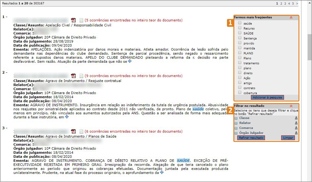 Quando é retornado na pesquisa um número grande de acórdãos é possível refinar mais os resultados através dos campos “Termos mais frequentes” (item 1 da figura) e “Filtrar no resultado” (item 2 da figura), localizados na parte direita da tela.