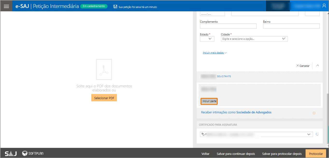 5. Para adicionar ao peticionamento intermediário alguma das partes do processo, clique no botão em “Incluir parte” que consta abaixo do nome de cada uma das partes.