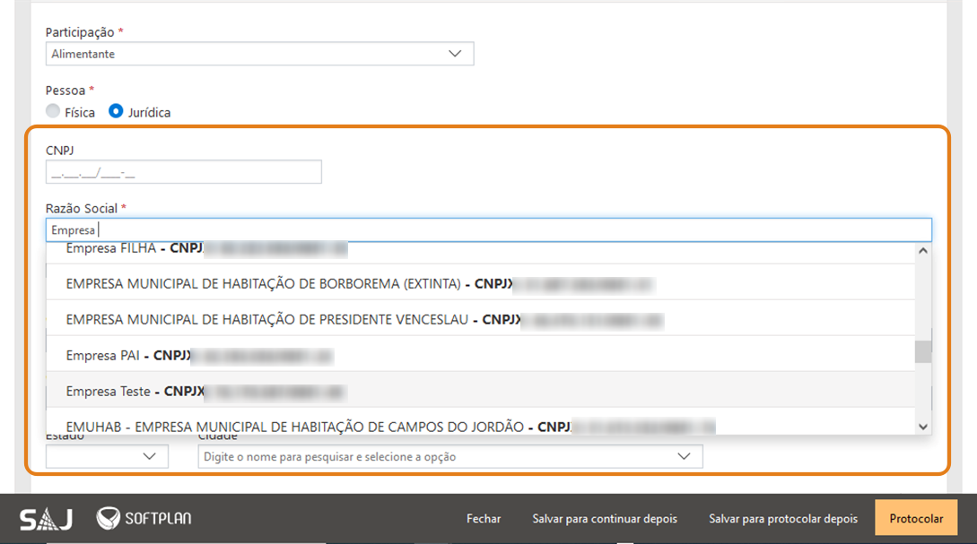 - O mesmo comportamento ocorre na funcionalidade de ‘Complemento de Cadastro’, também no Portal e-SAJ, ao informar um CNPJ ou um nome de uma empresa existente no CCC, a busca é realizada e se a empresa existente é selecionada pelo usuário os dados são obtidos do Cadastro Controlado Central.