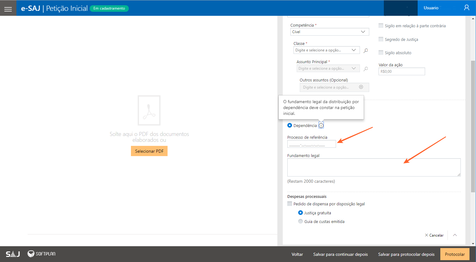 . Você terá acesso a mensagem "O fundamento legal da distribuição por dependência deve constar na petição inicial".