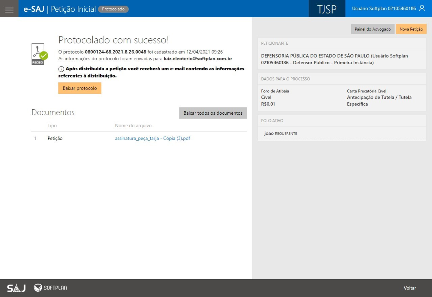 Após a finalização do peticionamento eletrônico inicial, será exibida a tela de conclusão com o número do protocolo e o link para download dos documentos protocolados. O sistema encaminhará um e-mail com os dados do protocolo.