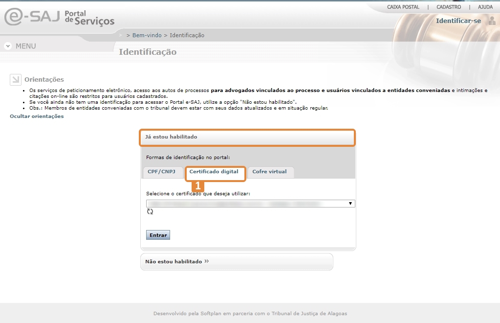 1. Você deve estar devidamente logado no e-SAJ, podendo efetuar sua identificação a partir de seu CPF ou certificado digital.