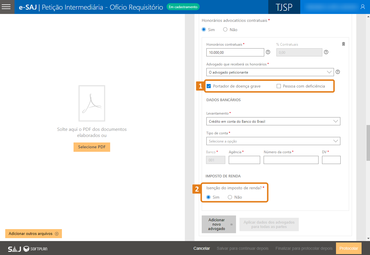 1.3 No Peticionamento de Intermediária de 1º grau Requisitórios, para os tipos de Petição de Requisitório: 1265 – Precatório e 1266 – Requisição de Pequeno Valor, quando houver indicação de valores para os honorários advocatícios (Honorários Sucumbenciais e % Sucumbências e/ou Honorários Contratuais ou % Contratuais) ao selecionar o advogado que receberá os honorários (sendo do tipo de pessoa “Física”), o sistema passa a exibir os campos “Portador de doença grave” e “Pessoa com deficiência” (1) para seleção.