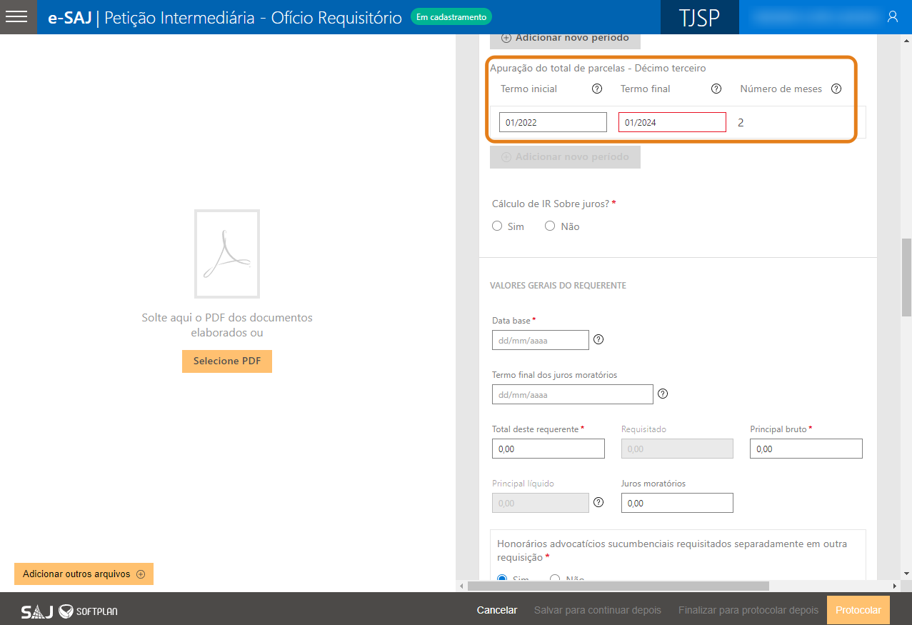 Versão: 23.2.0 | Publicado em: 09/08/2023A partir da versão 23.2.0, foram realizadas alterações no serviço de Peticionamento de Intermediária de 1º grau Requisitórios, para possibilitar o registro das informações de imposto de renda, cálculo de IR sobre os juros e das preferências (Portado de doença grave, pessoa com deficiência) para as partes representantes (Advogados e Sociedade de Advogados) com valores de honorários advocatícios informados para os requisitórios da natureza alimentar, cuja natureza do crédito seja remuneratória nas petições de requisitório da classe 1265 – Precatório e 1266 – Requisição de pequeno valor.