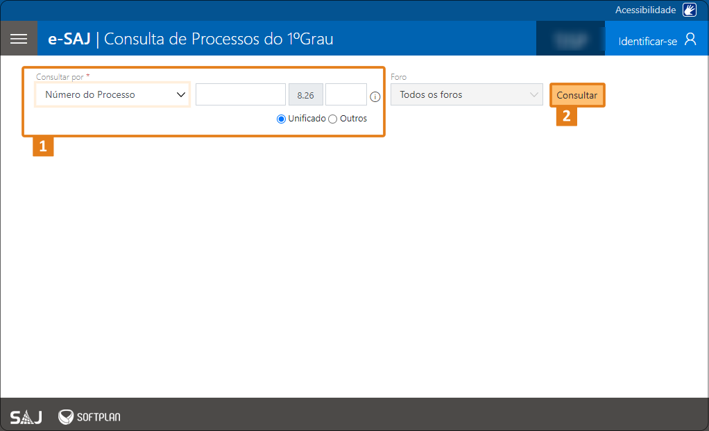 2. Insira os dados para pesquisar o processo, podendo ser a partir dos campos: