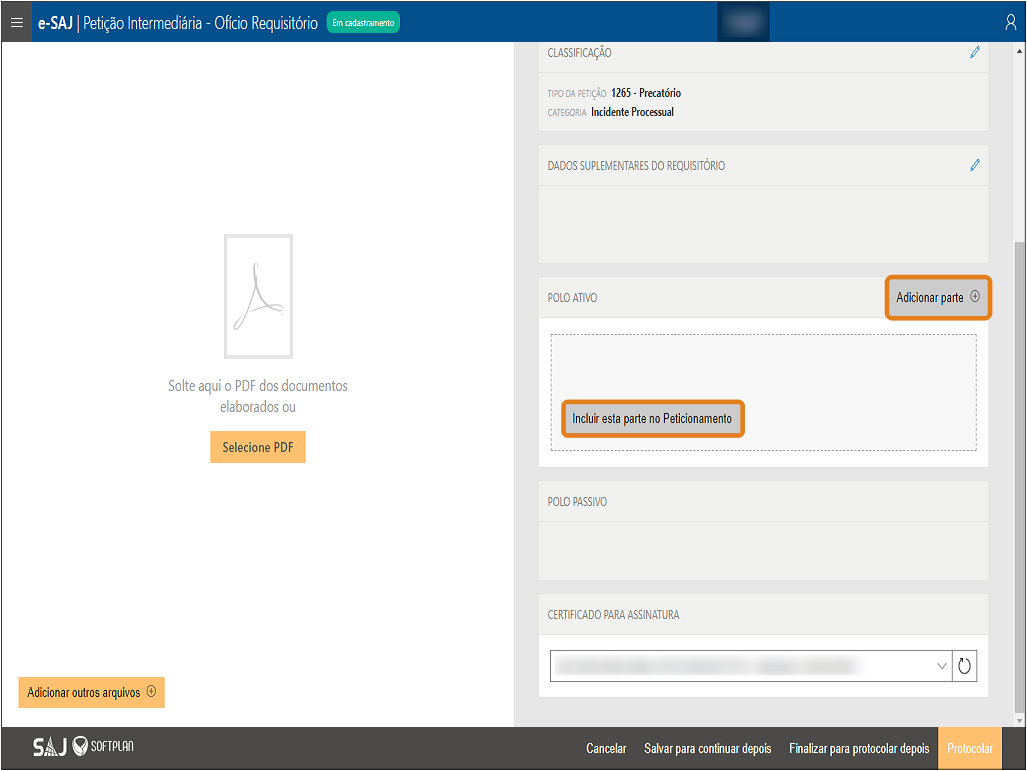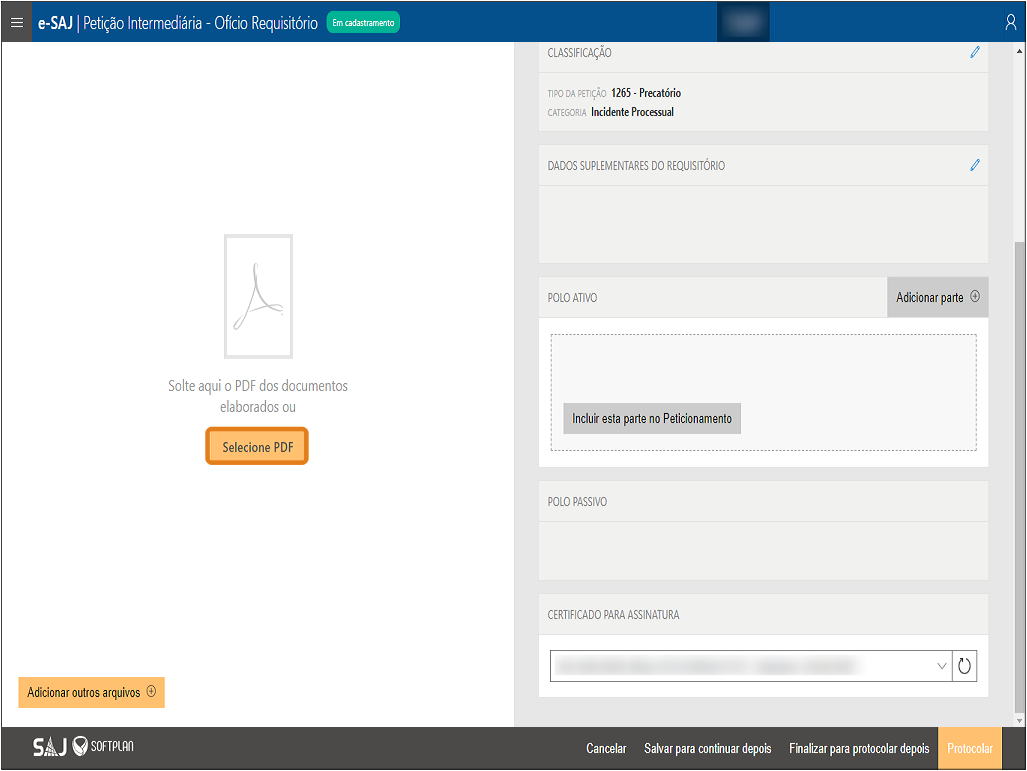 9. Para incluir documentos da petição, clique no botão "Selecione PDF" localizado ao lado esquerdo da tela.