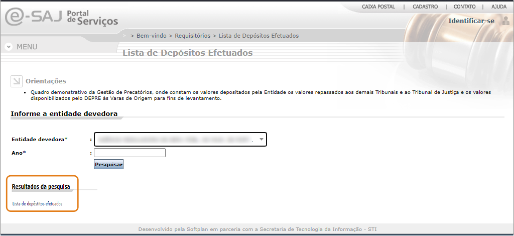 1. No menu do Portal e-SAJ, clique em “Requisitórios” e, em seguida, clique na opção Lista de Depósitos Efetuados.